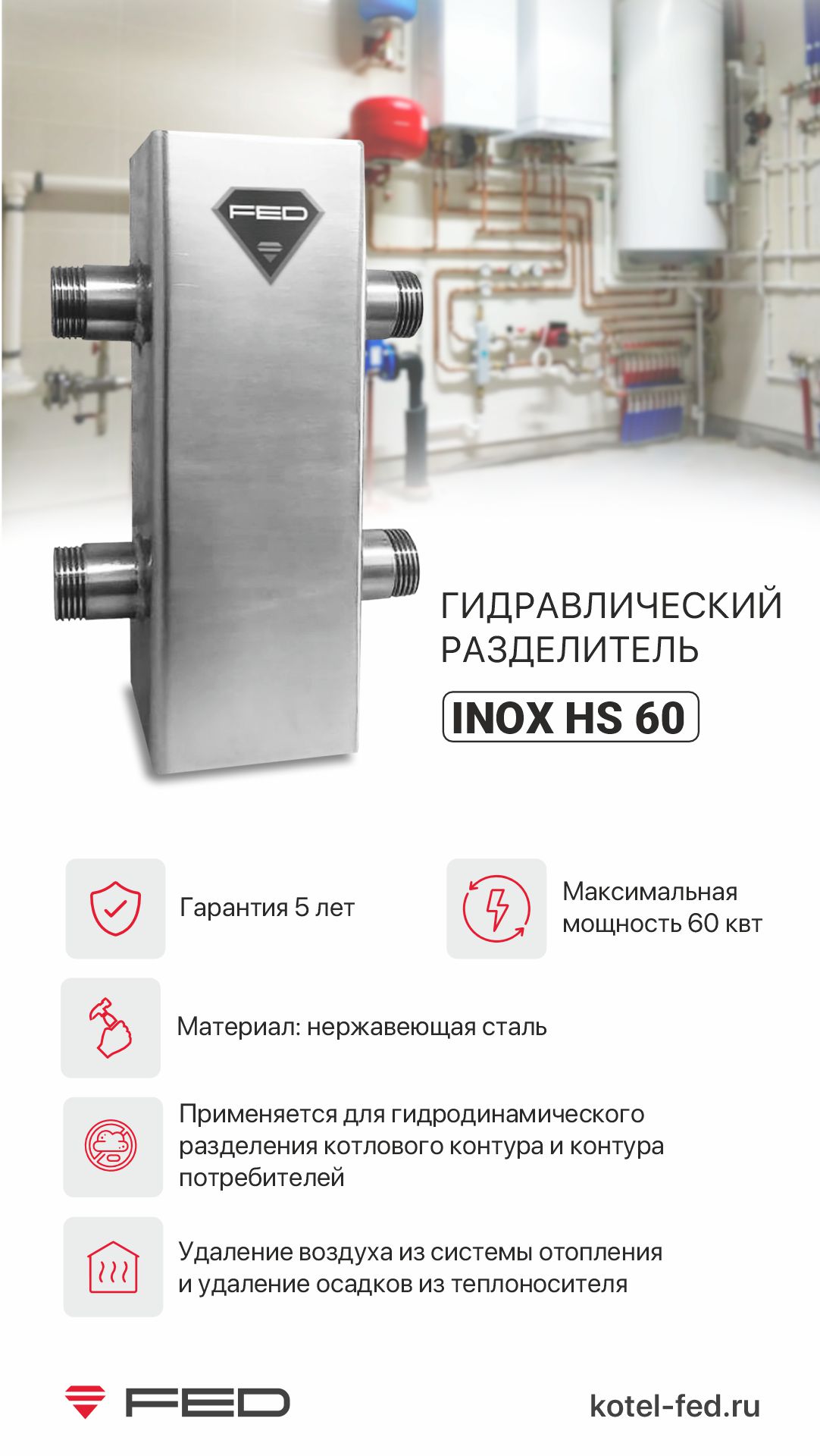 14.01.2026 Сервисное меню котла FED PRO 07.11.2025 Обзор газового настенного котла FED PRO Газовый котел FED PRO представлен в одноконтурном и двухконтурном варианте, линейка мощностей от 12 до 32 кВт. 04.09.2025 Управление котлом Fed Electric Подключение модуля управления к котлу Fed Electric. 18.07.2025 Обзор водонагревателя косвенного нагрева: изменения в конструкции 28.04.2025 Газовый водонагреватель FED Газовый водонагреватель INOX WH 200 с атмосферной горелкой предназначен для приготовления санитарной горячей воды в бытовых целях. 02.04.2025 Бойлер косвенного нагрева Inox по технологии "бак в баке" 03.12.2024 Обзор стабилизаторов ФЕД 26.11.2024 Парапетные котлы ФЕД Парапетный котел ФЕД - напольный газовый котел, устанавливаемый вплотную к стене.
